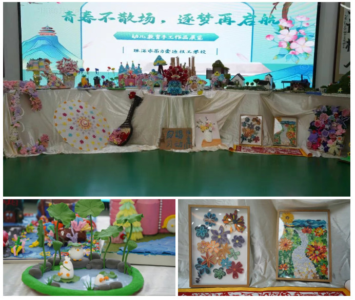 报告厅外,此刻也自成一道动人风景。走廊两侧整齐陈列着同学们亲手制作的手工作品——充满巧思的环保裱花、栩栩如生的纸艺创作、色彩绚丽的黏土雕塑……每一件都凝聚着他们对儿童世界的理解与想象。